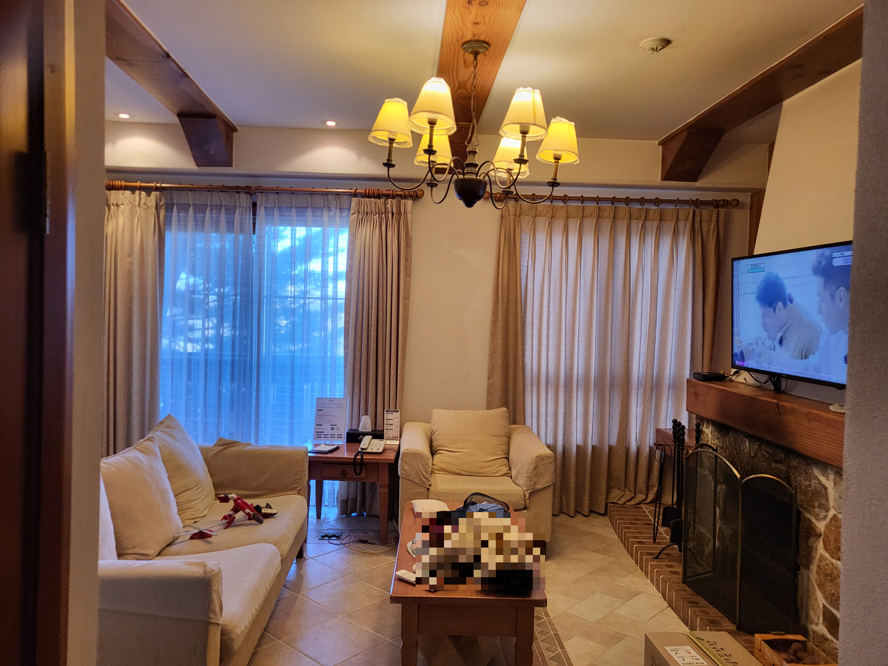 버치힐 45평형 객실의 가장 인상 깊은 포인트는 바로 거실 중앙의 벽난로입니다. 지난 겨울에는 장작을 피우고 고구마를 구워 먹으며 따뜻한 추억을 쌓았고, 장작과 고구마는 멤버스 하우스에서 구매할 수 있어 준비도 간편했습니다. 여름에는 사용하지 않았지만, 벽난로의 존재만으로도 공간에 운치를 더해줍니다.